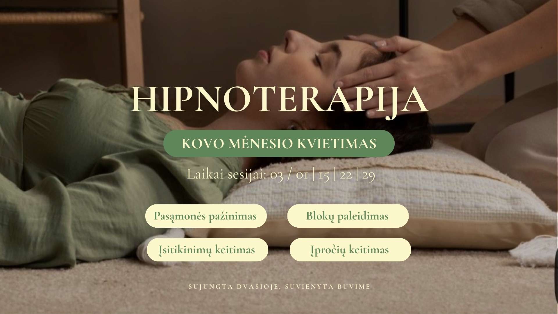 Hipnoterapija – tai ėjimas į pasąmonę, kur galima atrasti tikruosius atsakymus ir suteikti sau galimybę paleisti tai, kas sulaiko. Hipnoterapija padeda išlaisvinti įstrigusius įpročius, juos perprogramuoti, sumažinti praeities skaudulius, netektį, pažinti praeitus gyvenimus ar patirti giluminį atsipalaidavimą. Tai galingas būdas pasiekti gilų, pasąmoninį pokytį.